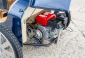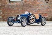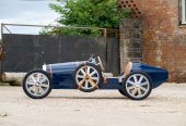 This handmade cyclekart was built by Frank Bankonin Cyclekarts in Germany to resemble a scaled-down version of the Bugatti Type 35 Grand Prix car. The aluminium body is finished in dark blue and features 18″ wheels, a faux radiator shell, a side-mount spare wheel, a Bugatti emblem, and dual seats trimmed in tan upholstery. The kart is also equipped with an electric starter, headlights, a disc brake, a faux fuel cap, a Brooklands-style windscreen, a faux engine starter handle and gear shifter, and a wood-rimmed steering wheel. Power is provided by a 212cc air-cooled Predator single linked to a torque converter.