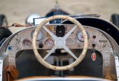 The 18″ silver-finished wire wheels have silver Bugatti-style aluminium inserts and knock-off spinners and are mounted with bias-ply tires. A matching spare wheel and tire are mounted on the left of the body. The kart is equipped with a black steel frame and rear inboard slotted disc brakes.