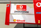 The nose cone is finished in the correct Ferrari red and white livery, featuring all the official sponsorship logos and decals from that era, including prominent branding from Vodafone, Shell, Fiat, Ferrari, and Bridgestone. These sponsor details are faithfully recreated, providing a visually striking and authentic representation of the original.