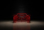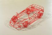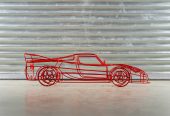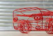 This wire sculpture was designed to resemble a Ferrari F50 and is constructed from red-painted steel wire. It measures approximately 4ft long, by 2ft wide and 1ft tall. It includes segments representing wing mirrors, headlights, vents, taillights, rear spoiler and wheels.
